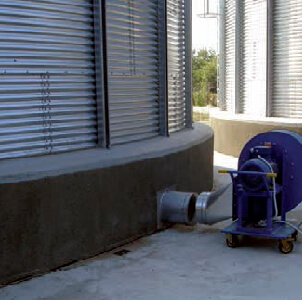 При необходимости в охлаждении мы можем установить холодильную установку передвижного типа, под названием CRIO MX. Эта установка довольно просто может подключаться к вентиляционным системам, благодаря применению воздуховодов быстроразъемного типа, а также вытяжным устройствам, которые устанавливаются на верху. Таким образом, за счет такой установки, осуществляется отличное охлаждение и вентиляция зерна.